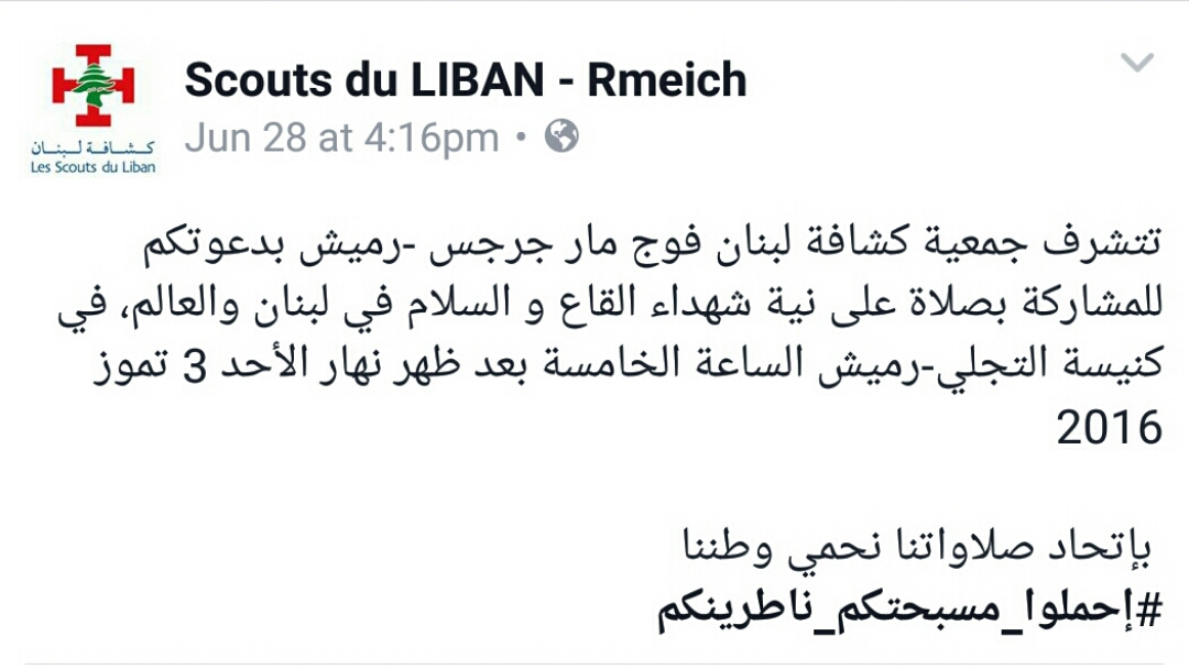 تتشرف جمعية كشافة لبنان فوج مار جرجس رميش بدعوتكم لحضور كارمس صيف 2016 في ساحة كنيسة التجليتتشرف جمعية كشافة لبنان فوج مار جرجس رميش بدعوتكم لحضور كارمس صيف 2016 |